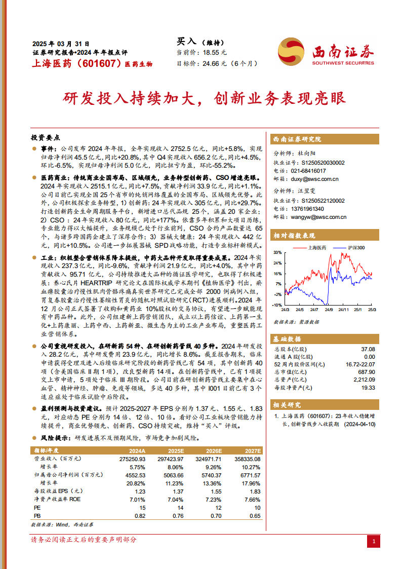上海医药在2024年实现了收入和归母净利润的双重增长,其中归母净利润同比大幅提升20.8%,显示出公司强劲的盈利能力。这一增长主要得益于公司持续加大的研发投入以及在医药商业领域创新业务的亮眼表现。公司积极推动业务转型,特别是在创新药和CSO(合同销售组织)业务上取得了高速增长,同时工业板块通过营销体系整合和中药大品种开发也取得了重要进展。