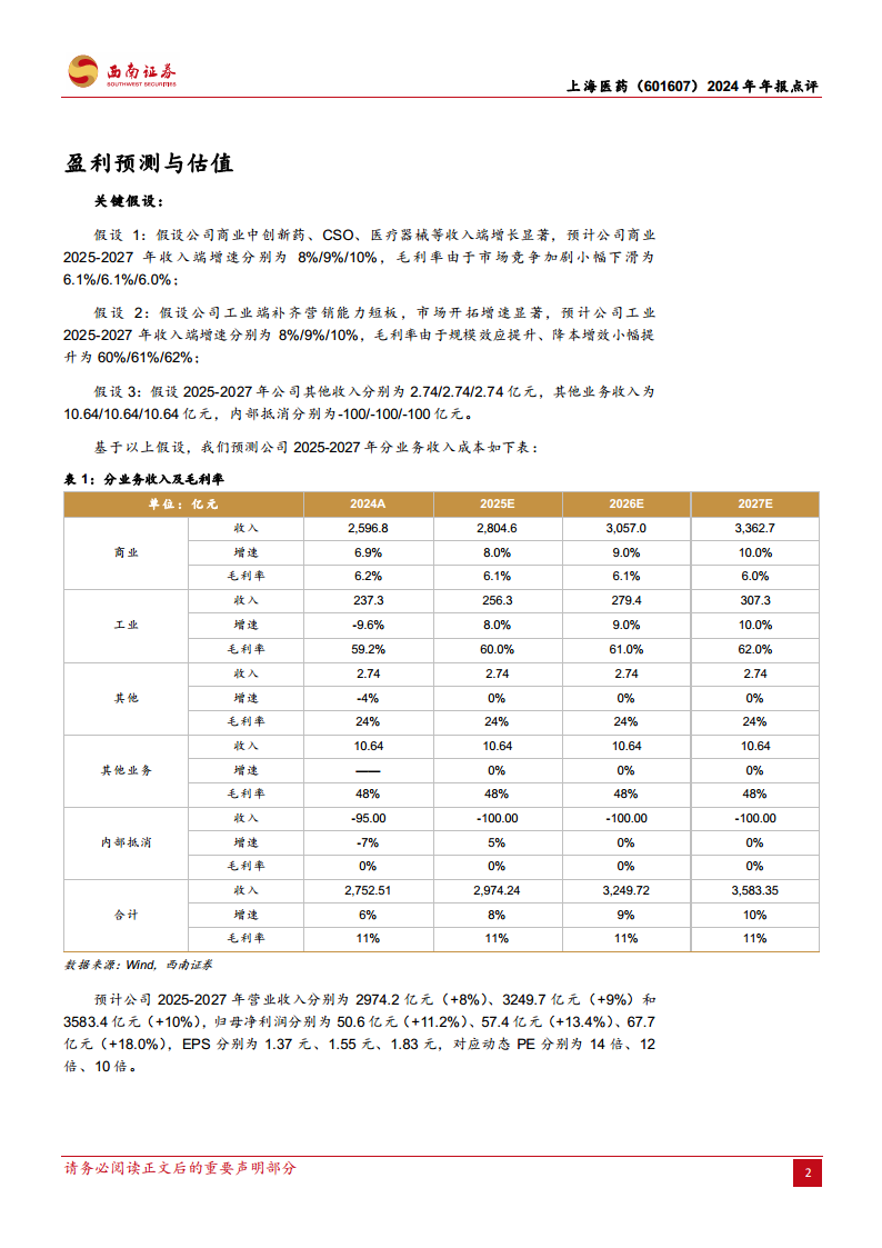 根据盈利预测,上海医药2025-2027年的动态市盈率(PE)分别为14倍、12倍和10倍。与可比公司(九州通、百洋医药、恒瑞医药)2025年平均市盈率23倍相比,上海医药的估值具有吸引力。公司作为流通龙头企业,旗下拥有雷氏、龙虎等众多中华老字号品牌,收购和黄药业股权有望进一步协同其营销实力。截至2024年年报,公司货币资金高达357.4亿元,财务实力雄厚。近年来,公司持续加大研发投入,依托重点实验室加速创新药研究,2024年创新药收入达到305.7亿元,同比增长29.7%,新药在研产品众多,多个新药管线已进入临床研究阶段。分析师给予公司2025年18倍PE,对应目标价24.66元,维持“买入”评级。 风险提示: 研发进展不及预期风险,市场竞争加剧风险。