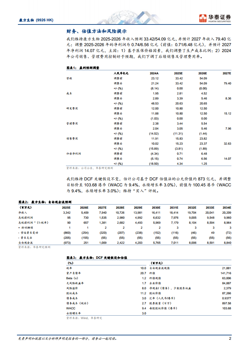 基于DCF(现金流折现)估值法,华泰研究维持关键假设不变(WACC为9.4%,永续增长率3.0%),将康方生物的目标价调整至103.68港币(前值为100.45港币),对应公司公允价值约873亿元人民币,并维持“买入”的投资评级。这一调整反映了市场对公司未来盈利能力和管线价值的积极预期。