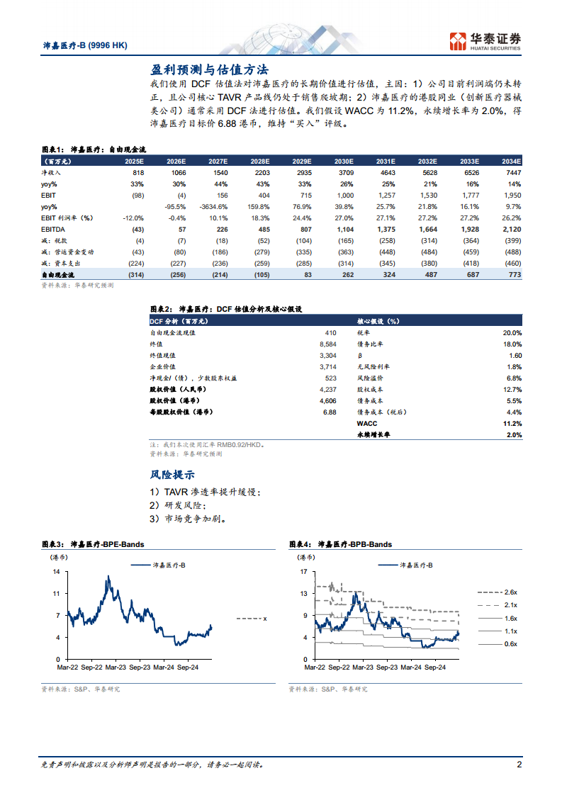 华泰研究对沛嘉医疗的盈利预测显示,随着TAVR行业渗透率的逐步提升,公司收入将持续增长。预计2025年至2027年收入分别为8.18亿元、10.66亿元和15.40亿元人民币,复合年增长率显著。净亏损预计在2025年收窄至0.83亿元人民币(较此前预测有所调整,主要考虑TMV/TTV研发费用投入),并有望在2026年实现净利润转正,达到0.10亿元人民币,2027年进一步增至1.5995亿元人民币,显示出公司盈利能力的显著改善。基于DCF估值法(假设WACC为11.2%,永续增长率为2%),华泰研究给予公司目标价6.88港币(较此前6.25港币有所上调,主要考虑到管线远期贡献),并维持“买入”投资评级。报告同时提示了TAVR渗透率提升缓慢、研发风险以及市场竞争加剧等潜在风险,建议投资者关注。