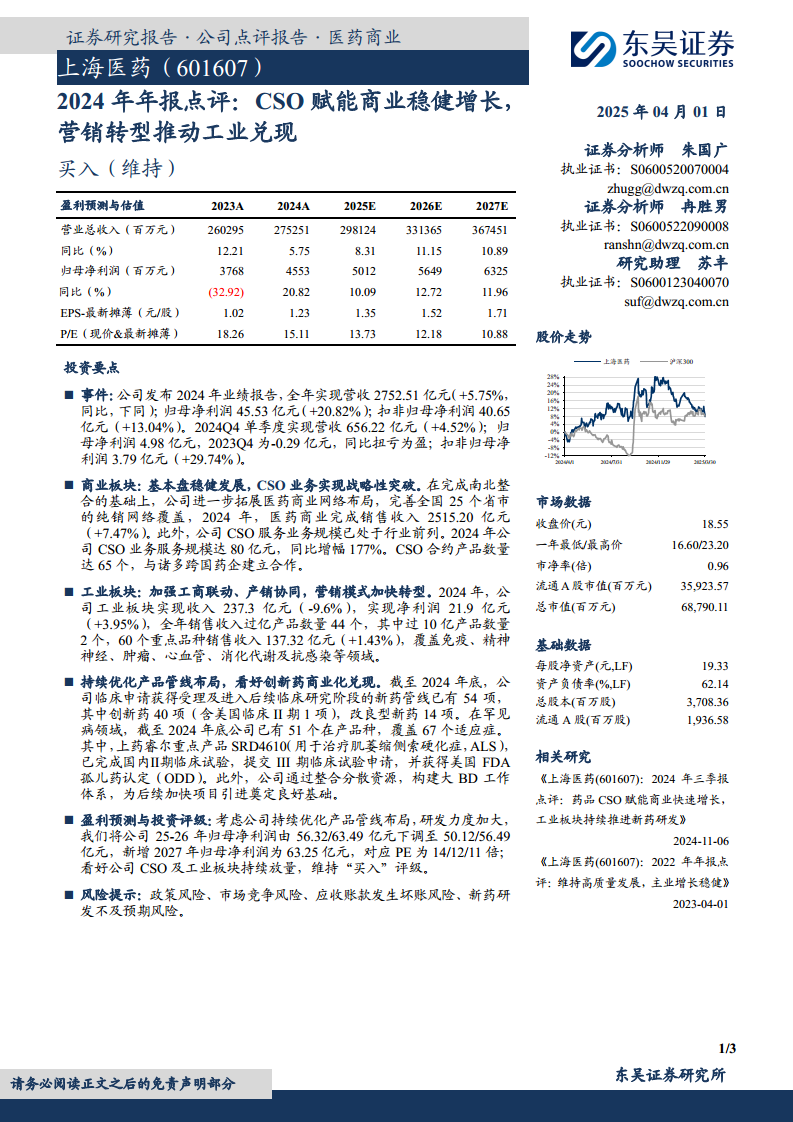 上海医药在2024年展现了稳健的经营态势,营收和归母净利润均实现增长,特别是归母净利润同比大幅提升20.82%。商业板块通过CSO业务的战略性突破,实现了177%的同比增幅,有效巩固了市场地位并拓展了服务边界。工业板块虽面临挑战,但通过营销转型和产品结构优化,净利润仍保持增长,且在创新药和罕见病领域持续投入,管线布局日益完善,SRD4610等重点项目进展顺利。尽管分析师下调了部分年份的盈利预测,但基于公司在商业模式创新和工业转型方面的努力,以及未来创新药商业化兑现的潜力,维持“买入”评级。投资者需关注政策、市场竞争、应收账款及新药研发等潜在风险。