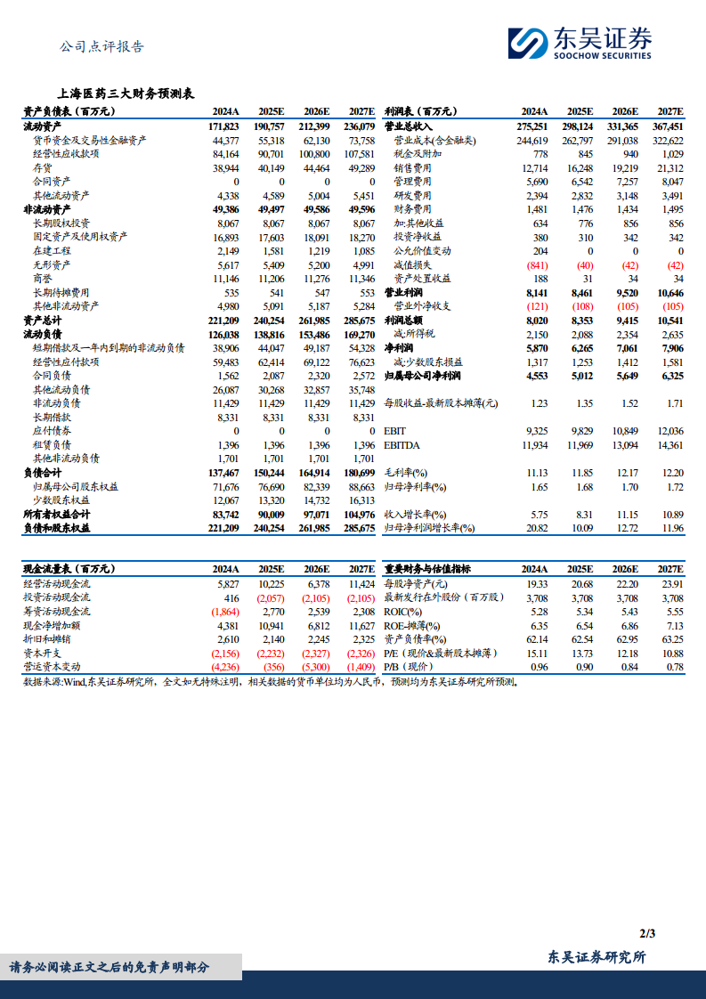 根据东吴证券研究所的预测,上海医药未来几年的关键财务指标如下: