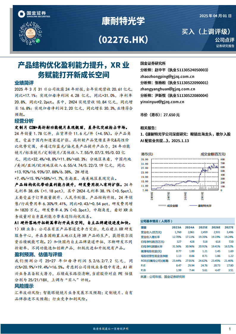 康耐特光学(02276):产品结构优化盈利能力提升,XR业务赋能打开新成长空间