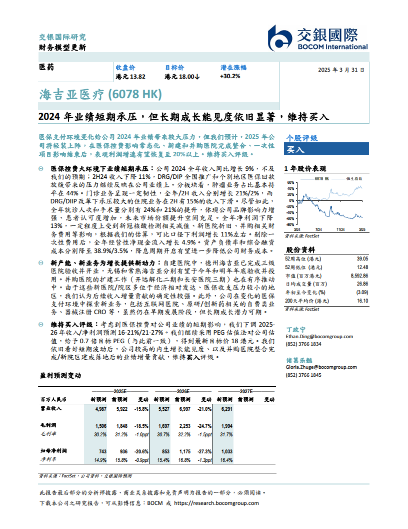 本报告核心观点指出,海吉亚医疗(6078 HK)在2024年面临医保支付环境变化带来的短期业绩压力,导致收入和净利润增长不及预期。然而,公司通过新建和并购医院的整合、新业务的探索以及品牌影响力的提升,展现出显著的长期成长能见度。预计2025年起,随着医保控费影响常态化和一次性项目影响结束,公司表观利润增速有望恢复至20%以上。