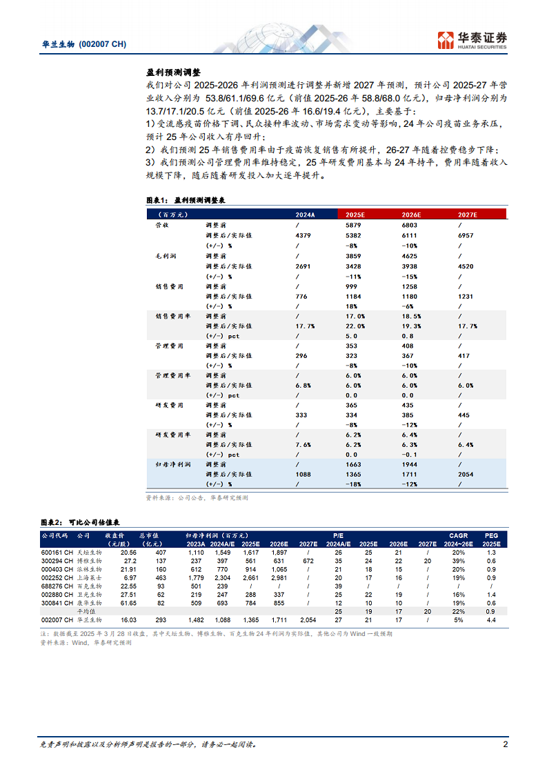 鉴于疫苗业务短期承压,华泰研究对华兰生物2025-2026年的盈利预测进行了调整,并新增了2027年预测。预计公司2025-2027年归母净利润分别为13.7亿元、17.1亿元和20.5亿元,其中2025-2026年的预测值较此前分别下调了18%和12%。此次调整主要基于2024年疫苗业务承压,预计2025年收入有序回升;2025年销售费用率因疫苗销售恢复而有所提升,随后在2026-2027年稳步下降;管理费用率保持稳定,研发费用率在2025年与2024年持平后,随着研发投入加大逐年提升。
