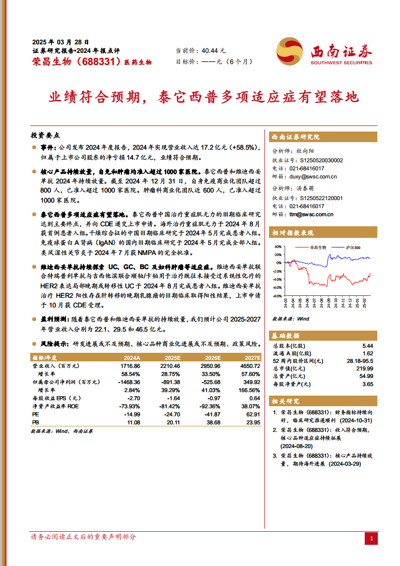 荣昌生物(688331):业绩符合预期,泰它西普多项适应症有望落地