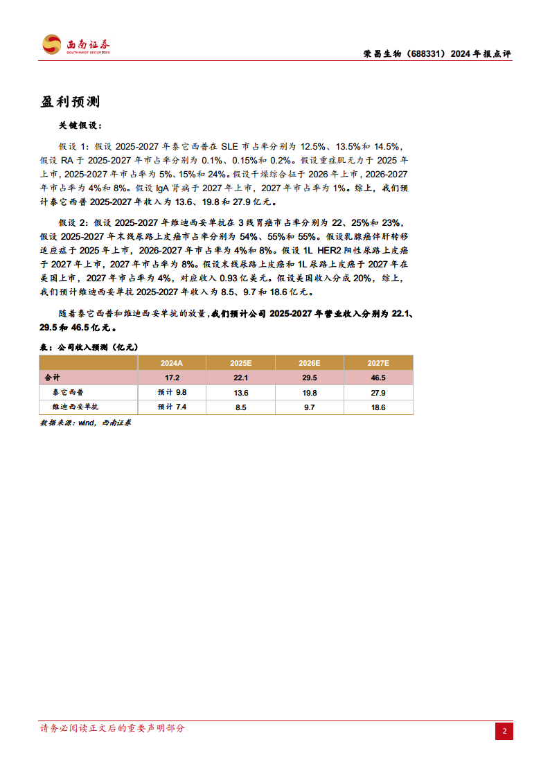 基于泰它西普和维迪西妥单抗的持续放量以及新适应症的逐步落地,公司预计2025年至2027年的营业收入将分别达到22.1亿元、29.5亿元和46.5亿元,呈现高速增长态势。其中,泰它西普预计在2025-2027年分别贡献收入13.6亿元、19.8亿元和27.9亿元;维迪西妥单抗预计同期贡献收入8.5亿元、9.7亿元和18.6亿元。然而,公司也面临研发进展或不及预期、核心品种商业化进展或不及预期以及政策风险等潜在挑战。