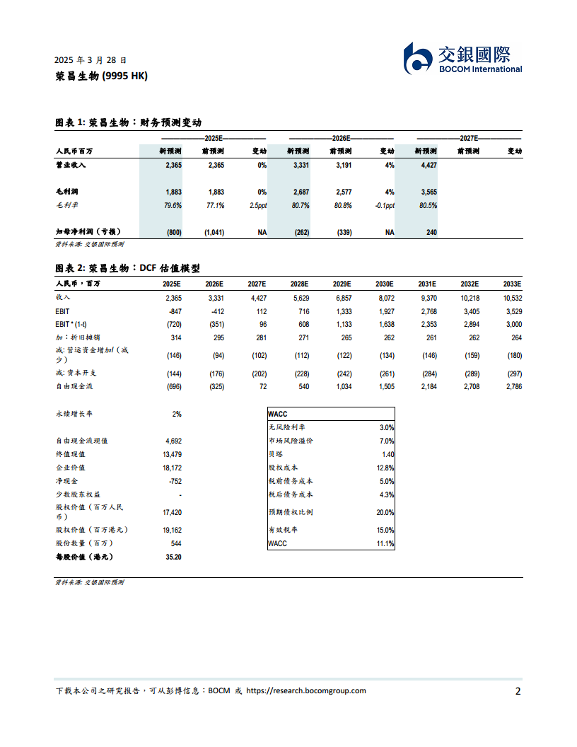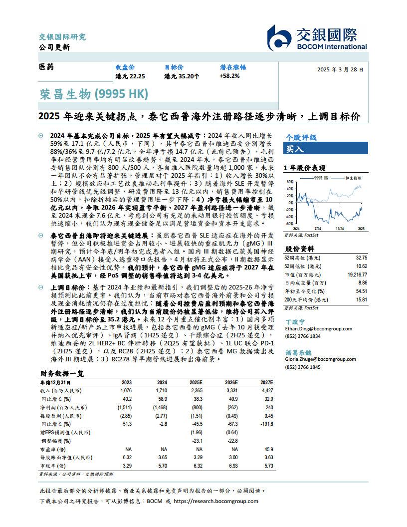 基于2024年业绩和最新指引,交银国际调整了荣昌生物2025-2026年的净亏损预测,预计亏损将比此前预测更窄。分析认为,当前市场对泰它西普海外前景和公司亏损及现金消耗情况存在过度担忧。随着公司控费后盈利预期的明确和泰它西普海外注册路径的逐步清晰,当前股价被显著低估。因此,交银国际维持公司“买入”评级,并将目标价上调至35.2港元。