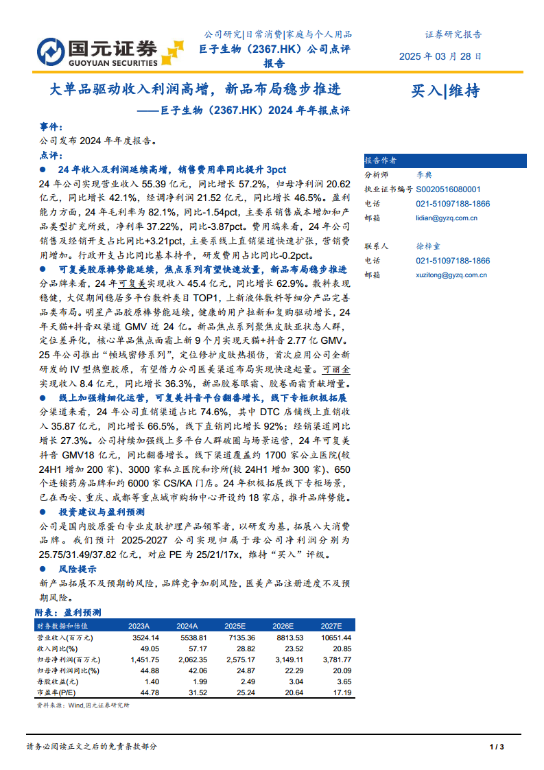巨子生物在2024年展现出强劲的增长势头,营业收入和归母净利润均实现高速增长。这主要得益于核心品牌可复美的优异表现、明星产品胶原棒的持续热销以及焦点系列等新品的成功推出。公司在渠道策略上,通过线上精细化运营实现了抖音平台GMV的翻番增长,同时积极拓展线下医院、药房及专柜布局,构建了多元化的销售网络。尽管销售费用率有所提升,但公司作为国内胶原蛋白专业皮肤护理产品领军者的地位稳固,未来有望通过持续的研发创新和渠道深耕,保持其增长态势。分析师维持“买入”评级,并对公司未来三年的盈利能力持乐观预期,但同时提示了新产品拓展、市场竞争和医美产品注册等潜在风险。