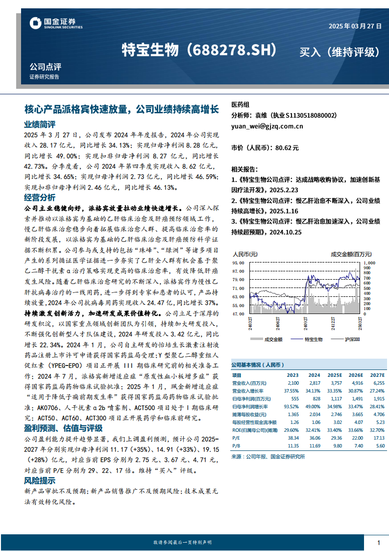 特宝生物在2024年展现了强劲的财务表现,营业收入和归母净利润均实现高速增长,核心产品派格宾的持续放量是业绩增长的主要驱动力。公司在乙肝临床治愈领域积累了丰富的科学证据,并持续加大研发投入,构建了多元化的创新产品管线,为未来增长奠定了坚实基础。基于对公司盈利能力的积极预期,分析师上调了盈利预测并维持“买入”评级。尽管面临新产品审批、销售推广及技术转化等潜在风险,但公司稳健的财务结构、强劲的现金流和高效的资产管理能力,共同支撑了其持续增长的潜力。