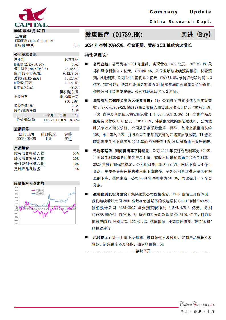 爱康医疗在2024年实现了强劲的业绩增长,归母净利润同比增长超50%,主要得益于集采续约后髋膝关节产品收入的显著恢复以及公司在市场份额和高层级医院拓展方面的成功。尽管毛利率受集采影响略有下降,但通过有效的费用控制,净利率得到显著提升。公司预计未来几年将继续保持快速增长,当前估值偏低,维持“买进”的投资建议。然而,投资者仍需关注集采上量、进口替代、定制产品增长、研发进度及原材料价格等潜在风险。