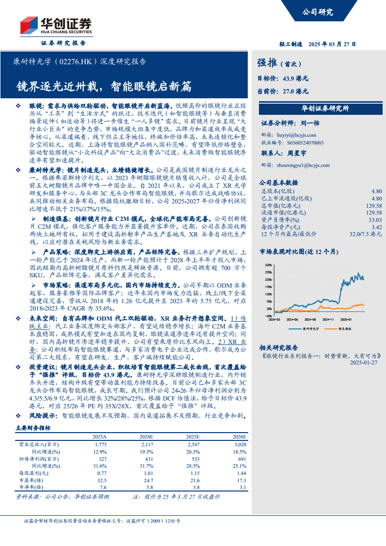 康耐特光学作为镜片制造行业的领军企业,凭借其在传统主业的深厚积累和对智能眼镜新赛道的积极布局,展现出强劲的增长潜力和广阔的未来空间。公司通过创新的C2M模式提升运营效率和客户粘性,全球化产能布局应对市场变化,并与上游供应商及头部3C企业深度合作,构建了坚实的竞争壁垒。随着智能眼镜市场迎来渗透率拐点,以及国内高折镜片渗透率的持续提升,康耐特光学有望实现传统业务的结构升级和新业务的爆发式增长。华创证券首次覆盖给予“强推”评级,目标价43.9港元,看好公司在视光主业和智能眼镜领域的双轮驱动发展。