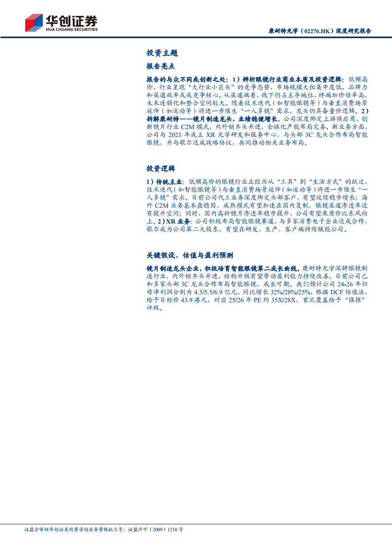 华创证券预计康耐特光学2024-2026年归母净利润分别为4.3亿元、5.5亿元和6.9亿元,同比增长32%、28%和25%。传统业务方面,看好渠道建设与高折镜片渗透率提升,收入有望保持双位数增长(标准化镜片2024-2026年营收预计分别为16.8/19.8/22.8亿元,定制镜片分别为4.2/4.8/5.4亿元)。智能眼镜业务作为第二成长曲线,预计2025-2026年将实现营收0.7亿元和1.6亿元。结构优化叠加规模效应,中长期盈利能力有望稳步提升,预计2024-2026年毛利率分别为38.9%、39.8%和40.8%。根据DCF估值法,给予目标价43.9港元,对应2025/2026年PE约35X/28X,首次覆盖给予“强推”评级。
