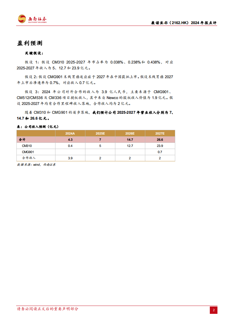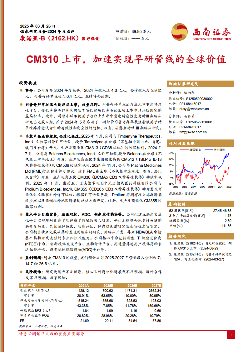 公司2024年收入达4.3亿元,其中合作收入贡献3.9亿元,司普奇拜单抗收入0.4亿元,业绩符合预期。展望未来,随着CM310的放量和持续的对外合作收入,预计2025-2027年营业收入将分别达到7亿元、14.7亿元和26.6亿元,呈现高速增长态势。公司有望在2027年实现归母净利润转正,净资产收益率(ROE)预计达到10.79%,标志着盈利能力的显著改善。