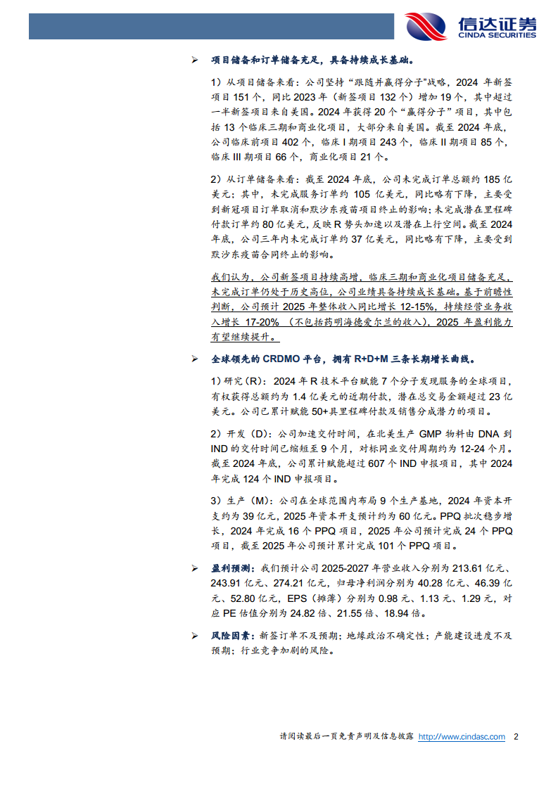 药明生物凭借其全球领先的CRDMO(合同研究、开发和生产)平台,构建了研究(R)、开发(D)和生产(M)三条长期增长曲线。公司持续通过“跟随并赢得分子”战略,不断增加新签项目和“赢得分子”项目储备,尤其在临床三期和商业化项目方面储备充足。截至2024年底,公司未完成订单总额高达185亿美元,为未来业绩持续增长奠定了坚实基础。公司预计2025年持续经营业务收入将实现17-20%的增长,盈利能力有望进一步提升。