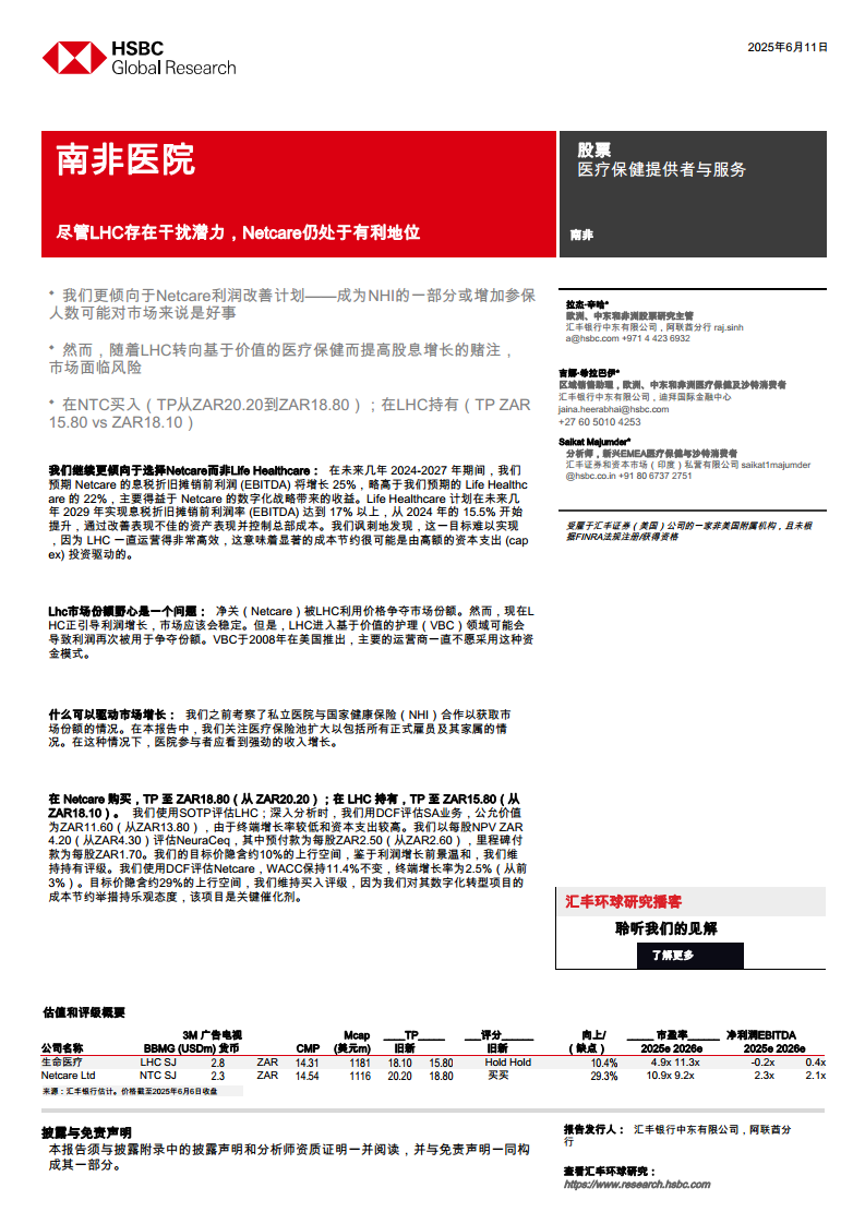 本报告对Netcare和Life Healthcare的财务表现进行了详细分析,并基于估值模型给出了投资评级和目标价,同时识别了潜在的投资风险。