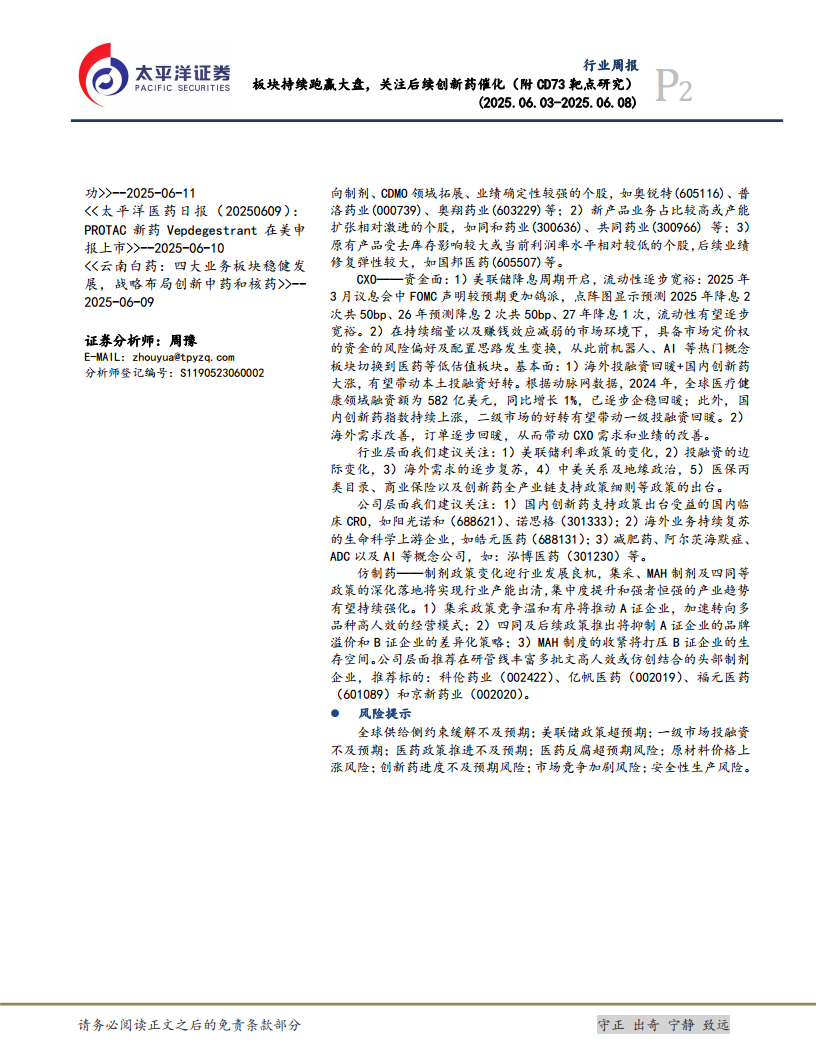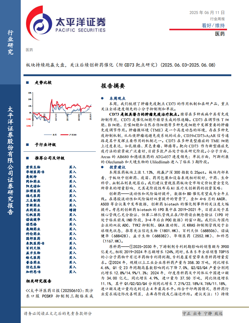 本周医药板块表现优于大盘,主要得益于创新药、疫苗、药用包装和设备等细分领域的强劲增长。市场资金正逐步转向医药等低估值板块,叠加美联储降息预期带来的流动性改善,为行业发展提供了有利环境。肿瘤免疫治疗靶点CD73展现出巨大潜力,多款在研产品进入后期临床,特别是德琪医药的ATG-037在CPI耐药患者中显示出积极疗效。投资策略上,报告建议重点关注创新药、原料药、CXO和仿制药四大领域,并提供了详细的投资逻辑和具体公司推荐。同时,报告也提示了全球供给侧、宏观政策、投融资及市场竞争等方面的潜在风险。整体而言,医药行业在创新驱动和政策优化的背景下,结构性增长趋势明显,具备长期投资价值。