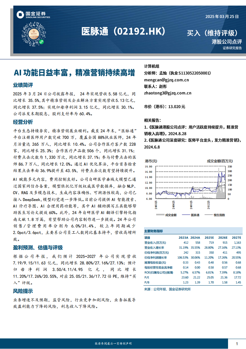 医脉通公司在2024年取得了令人瞩目的业绩,营收和归母净利润均实现高速增长,这主要得益于其“医脉通”平台用户规模的持续扩大、精准营销业务的成功拓展以及AI技术在提升运营效率和内容质量方面的显著贡献。公司在保持高增长的同时,有效控制了运营费用,进一步巩固了盈利基础。展望未来,分析师对公司营收和净利润的持续增长持乐观态度,并维持“买入”评级。然而,投资者仍需关注业务增速不及预期、监管政策变化、行业竞争加剧以及业务拓展可能带来的盈利能力波动等潜在风险。总体而言,医脉通凭借其强大的平台生态、前瞻性的AI战略和稳健的财务表现,展现出良好的长期发展潜力。