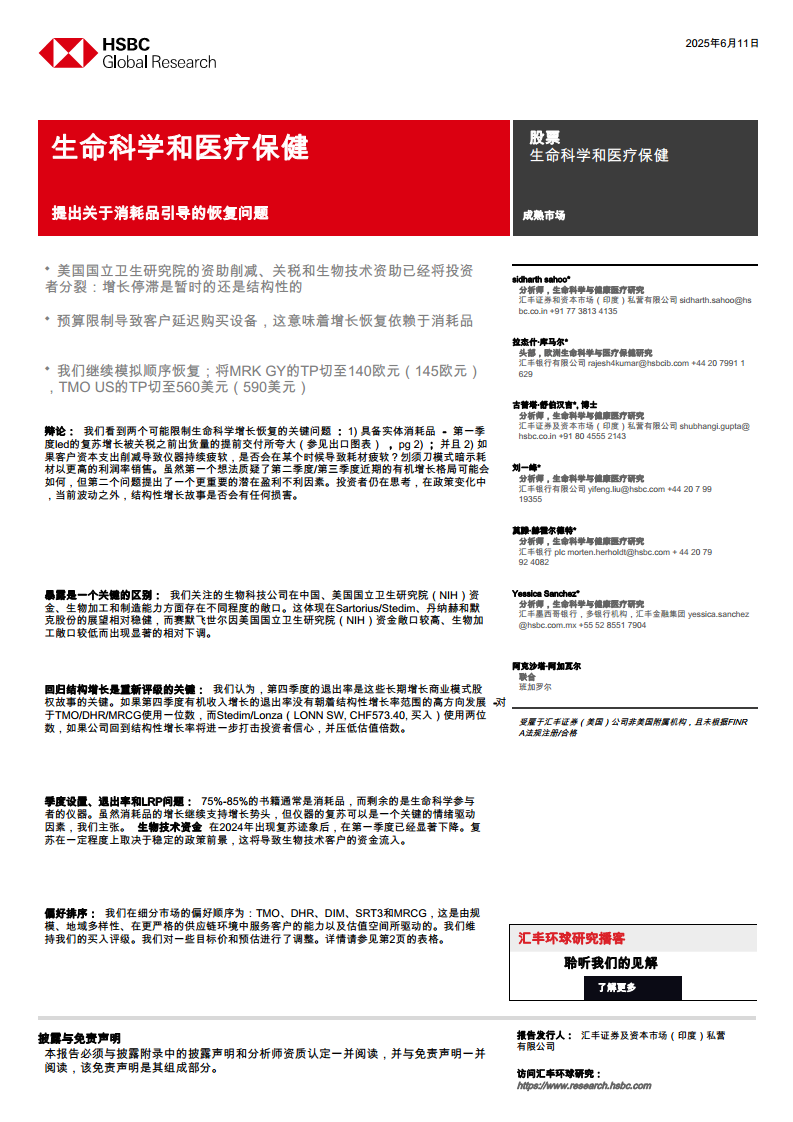 本报告核心观点指出,生命科学与医疗保健行业正经历由消耗品驱动的复苏,但其可持续性面临严峻挑战。美国国立卫生研究院(NIH)资助削减、关税政策以及生物技术融资环境的变化,导致投资者对当前增长停滞是暂时性周期波动还是结构性问题产生了分歧。客户预算限制导致设备采购延迟,使得行业增长高度依赖消耗品,而消耗品增长的真实性(是否因关税前提前出货而夸大)和长期可持续性(设备疲软是否最终传导至耗材)成为关键疑问。