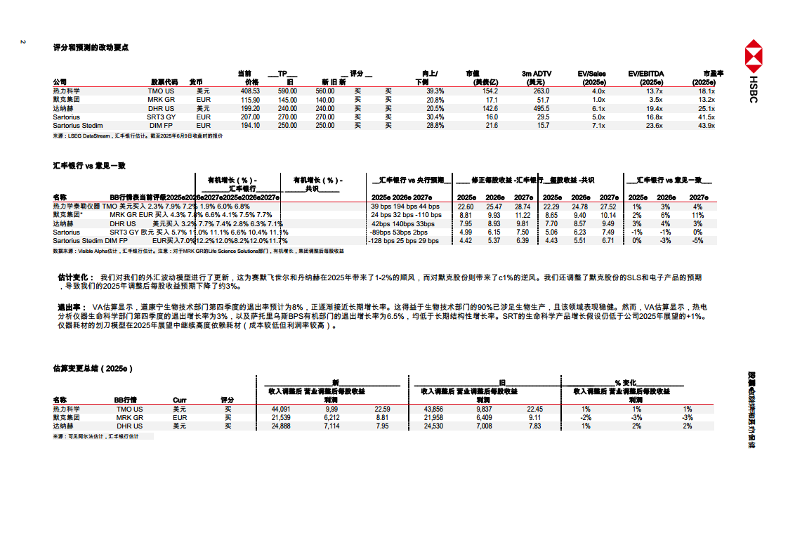 在有机增长方面,汇丰银行对2025年、2026年和2027年的预测与市场共识存在细微差异。例如,汇丰预计赛默飞世尔2025年有机增长率为2.3%,略高于共识的1.9%;默克集团2025年有机增长率为4.3%,高于共识的4.1%。在每股收益(EPS)修正方面,汇丰银行对赛默飞世尔2025年EPS预测为22.60美元,较共识高1%;对默克集团2025年EPS预测为8.81欧元,较共识高2%。这些差异表明汇丰银行对部分公司的增长前景持更为积极的看法,尤其是在生物技术和生命科学解决方案领域。