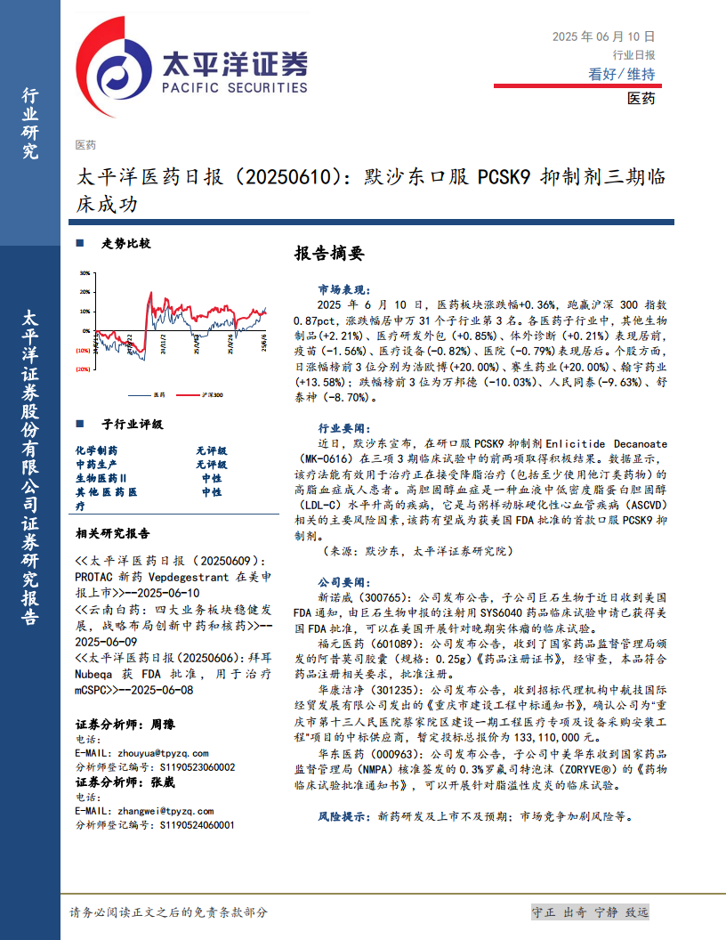2025年6月10日,医药板块整体表现强劲,跑赢大盘,其中生物制品、医疗研发外包和体外诊断等子行业表现突出。默沙东口服PCSK9抑制剂三期临床的成功,标志着创新药研发取得重大进展,有望为高脂血症治疗带来革命性突破。同时,多家上市公司在药品注册、临床试验和项目中标方面取得积极进展。尽管行业前景乐观,但新药研发及上市不及预期、市场竞争加剧等风险仍需投资者警惕。太平洋证券维持对医药行业的“看好”评级。