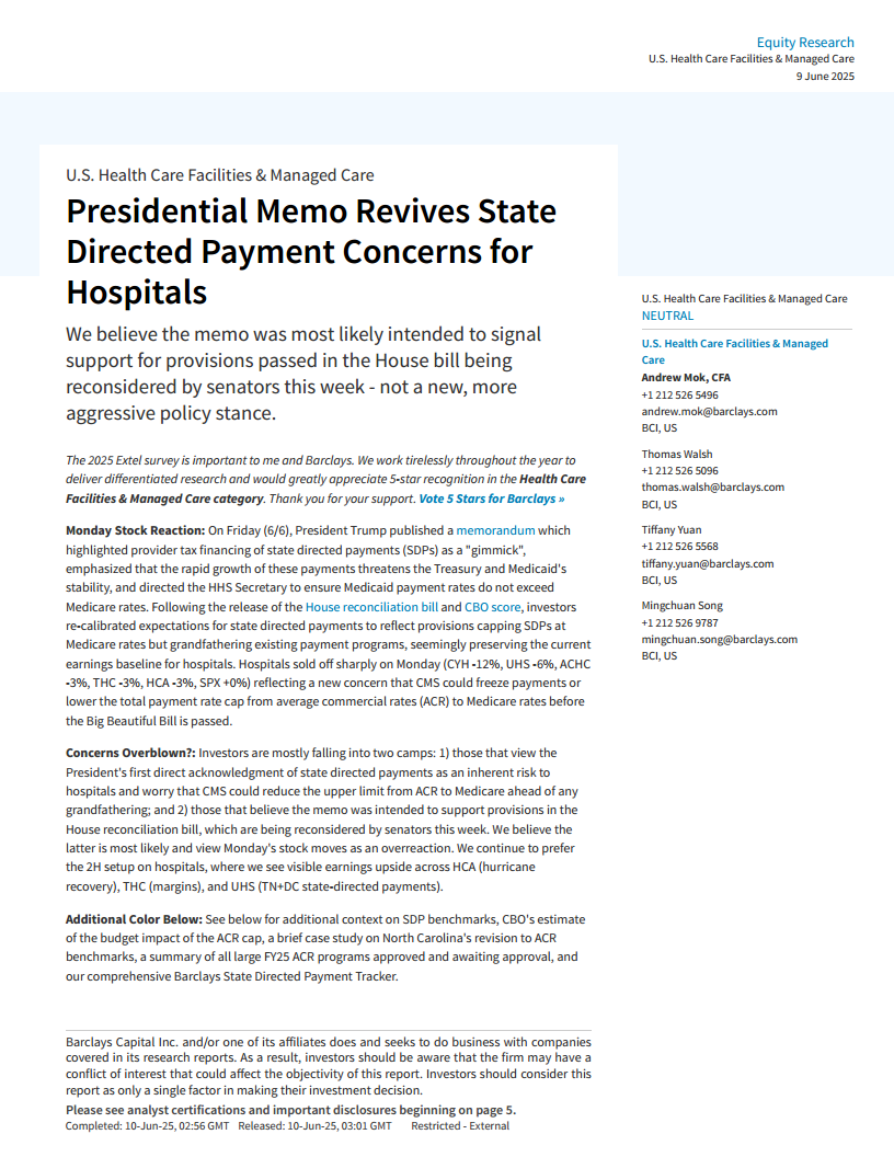 市场对总统备忘录的解读分为两派:一派认为这是对医院的固有风险,担心CMS可能在任何“祖父条款”生效前,将支付上限从平均商业费率(ACR)降低至医疗保险费率;另一派则认为备忘录旨在支持众议院和解法案中将SDPs上限设定为医疗保险费率但保留现有支付项目的条款。巴克莱倾向于后者,认为周一的股价波动是过度反应。分析师继续看好医院板块在2025年下半年的表现,预计HCA(飓风恢复)、THC(利润率)和UHS(田纳西州+华盛顿特区州定向支付)的盈利将有明显增长。