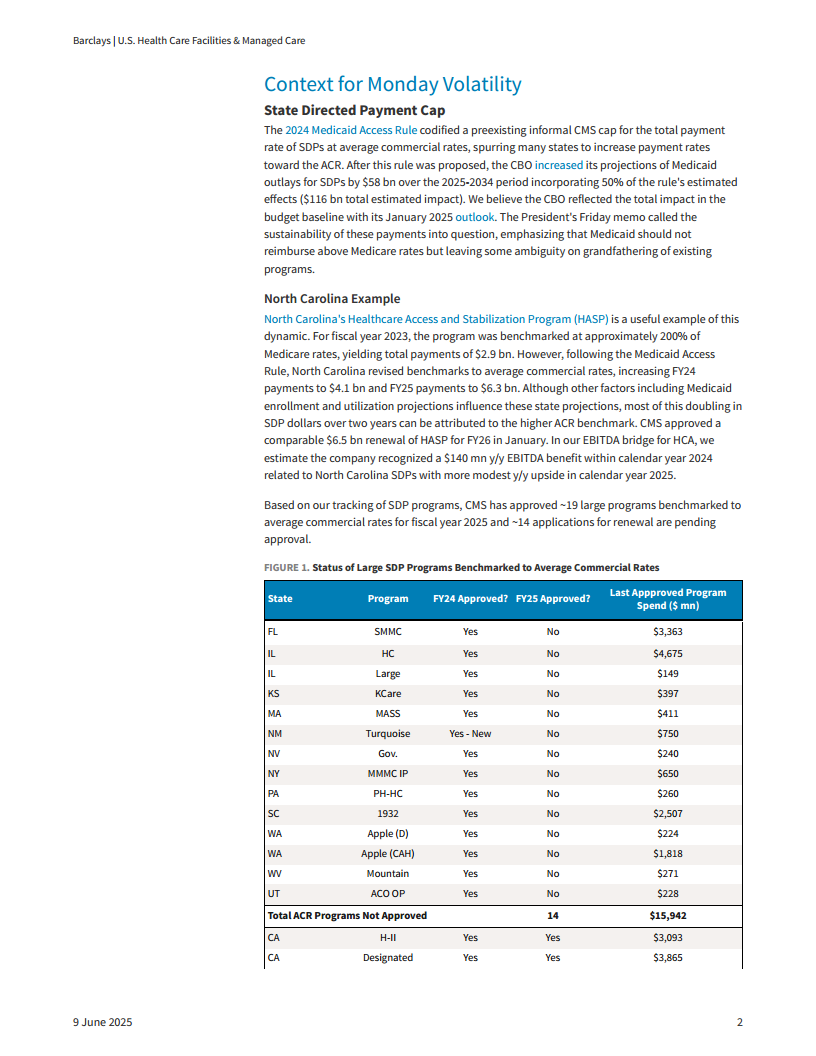 2025年6月6日,美国总统发布备忘录,将提供者税收融资的州定向支付(SDPs)描述为“花招”,并强调其快速增长威胁到财政和医疗补助计划的稳定性。备忘录指示卫生与公众服务部(HHS)部长确保医疗补助支付费率不超过医疗保险费率。受此消息影响,医院股票在周一(6月9日)大幅下跌,其中Community Health Systems Inc. (CYH) 下跌12%,Universal Health Services Inc. (UHS) 下跌6%,Acadia Healthcare (ACHC)、Tenet Healthcare Inc. (THC) 和HCA Healthcare, Inc. (HCA) 均下跌3%。