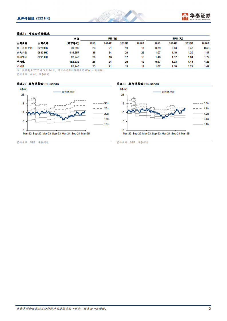 华泰研究基于康师傅控股稳健的收入韧性、产品结构升级、竞争格局稳定以及经营管理收效等积极因素,上调了盈利预测。预计2025年至2027年每股收益(EPS)分别为0.73元、0.80元和0.85元,较前次预测分别上调9%和11%。参考可比公司2025年平均市盈率(PE)20倍,给予公司2025年20倍PE,对应目标价15.65港币(前次为12.33港币),维持“买入”评级。