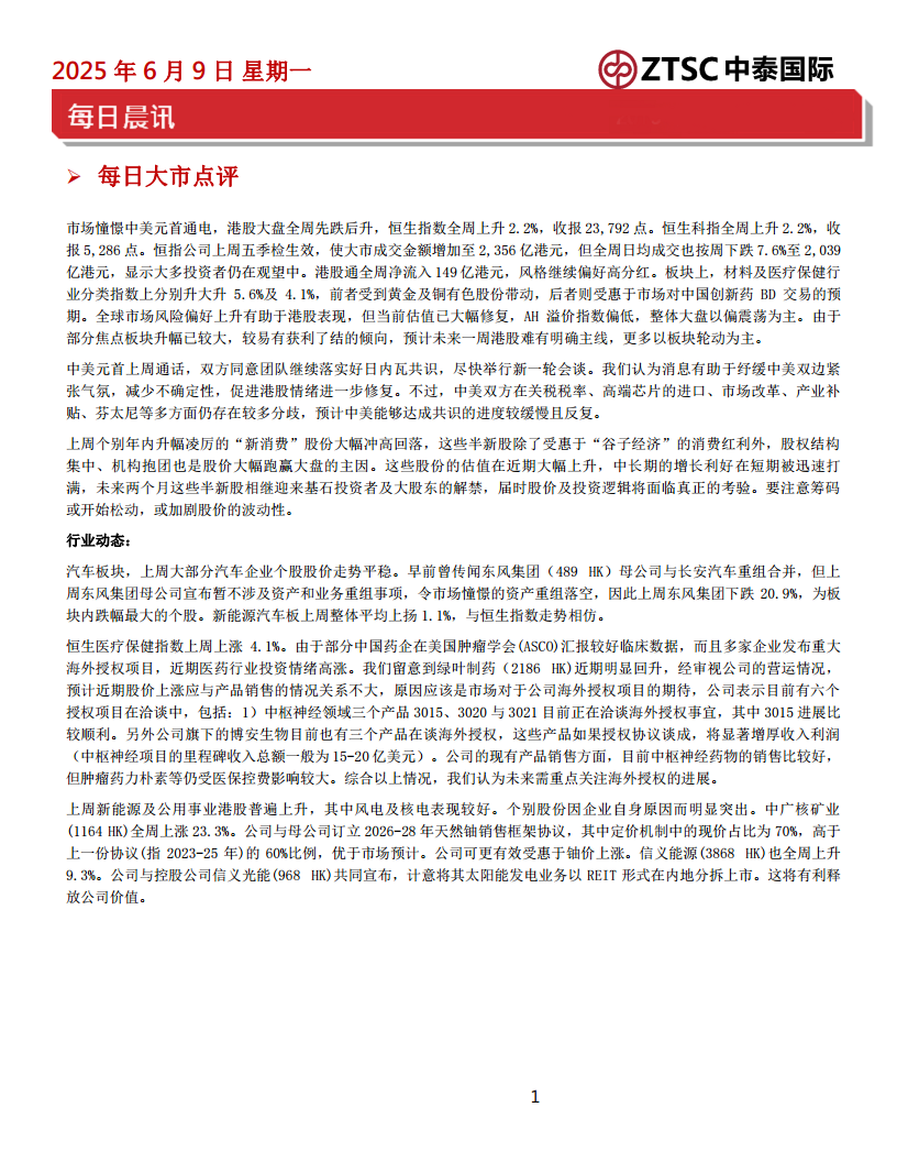 本报告分析了2025年6月9日当周港股市场表现及未来展望,指出市场受中美关系缓和提振,但成交量显示观望情绪,预计将以震荡和板块轮动为主。在行业层面,医疗保健板块因创新药出海和海外授权预期而表现强劲,新能源及公用事业板块受益于政策支持和商品价格走势。具体投资机会方面,建议关注火电股在夏季旺季的盈利潜力,以及翰森制药等具有国际化研发实力的医药企业。同时,需警惕部分“新消费”股的估值风险和解禁压力。