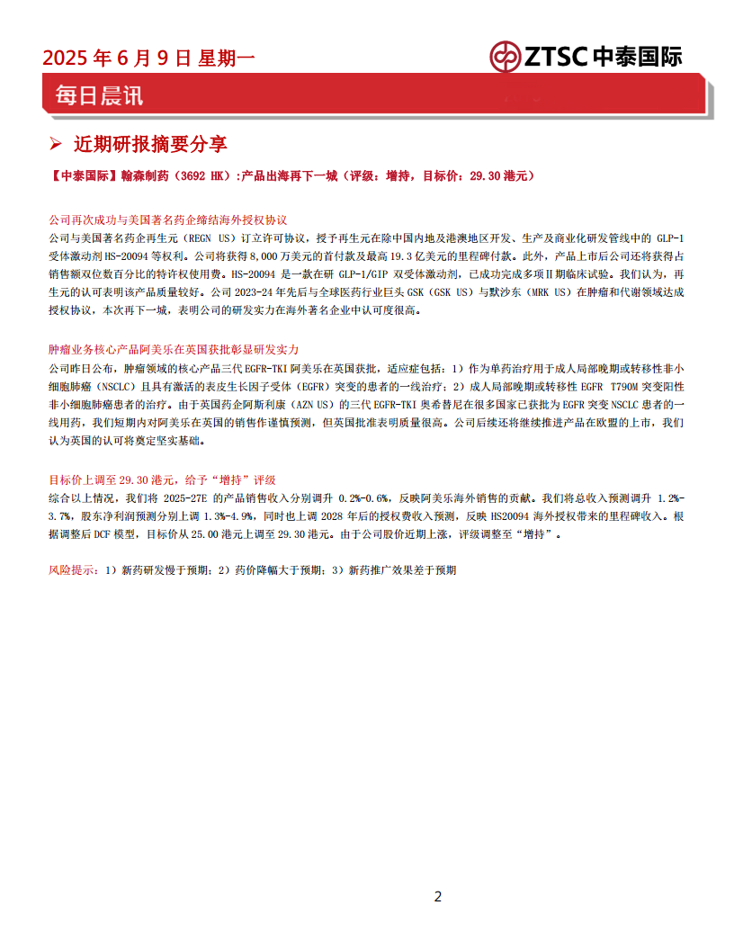 翰森制药再次成功与美国著名药企再生元(REGN US)缔结海外授权协议,授予再生元在除中国内地及港澳地区开发、生产及商业化研发管线中的GLP-1受体激动剂HS-20094等权利。公司将获得8,000万美元的首付款及最高19.3亿美元的里程碑付款,此外产品上市后还将获得占销售额双位数百分比的特许权使用费。再生元的认可表明该产品质量较好,本次再下一城,表明公司的研发实力在海外著名企业中认可度很高。同时,公司肿瘤领域的核心产品三代EGFR-TKI阿美乐在英国获批,彰显研发实力,为后续在欧盟的上市奠定坚实基础。中泰国际将目标价上调至29.30港元,给予“增持”评级。