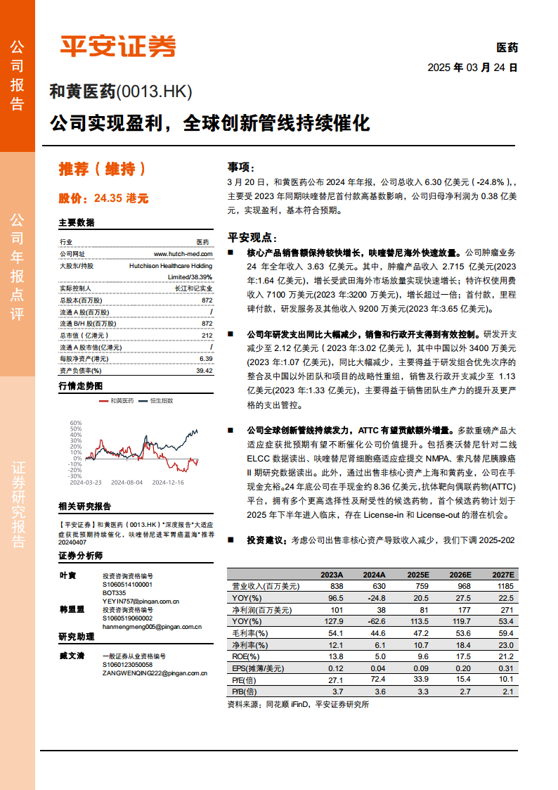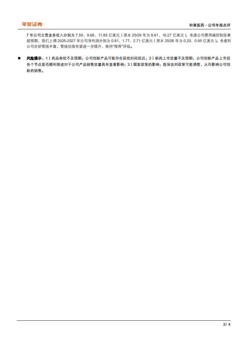 - 维持“推荐”评级:综合考虑公司在研管线丰富性及其估值提升潜力,平安证券维持对和黄医药的“推荐”评级。