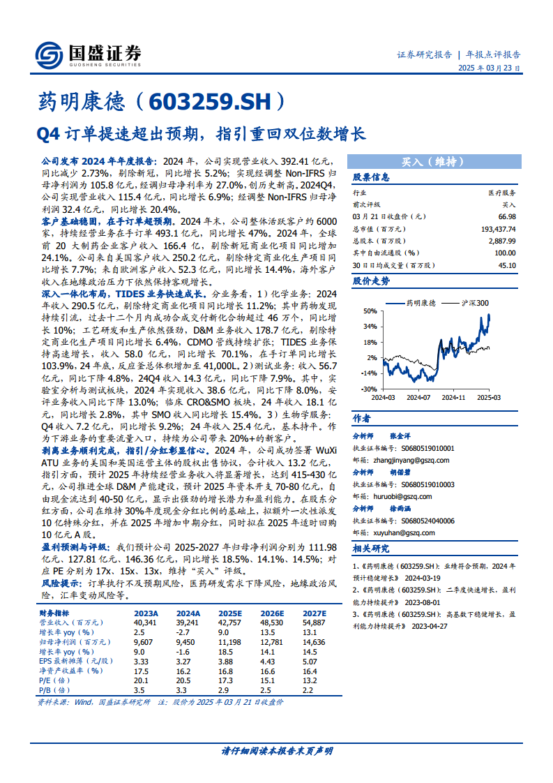 公司通过成功剥离非核心业务,进一步优化了战略布局。对2025年,公司给出了415-430亿元的营收指引,并计划加大D&M产能建设投入,预计自由现金流充裕。同时,公司通过多项股东回报政策,包括维持高比例现金分红、额外特殊分红以及A股回购计划,充分体现了对未来发展的信心和对股东价值的重视。综合来看,药明康德凭借其一体化CRDMO和CTDMO服务模式,在全球医药研发外包市场中保持领先地位,未来增长潜力可期,因此维持“买入”评级。