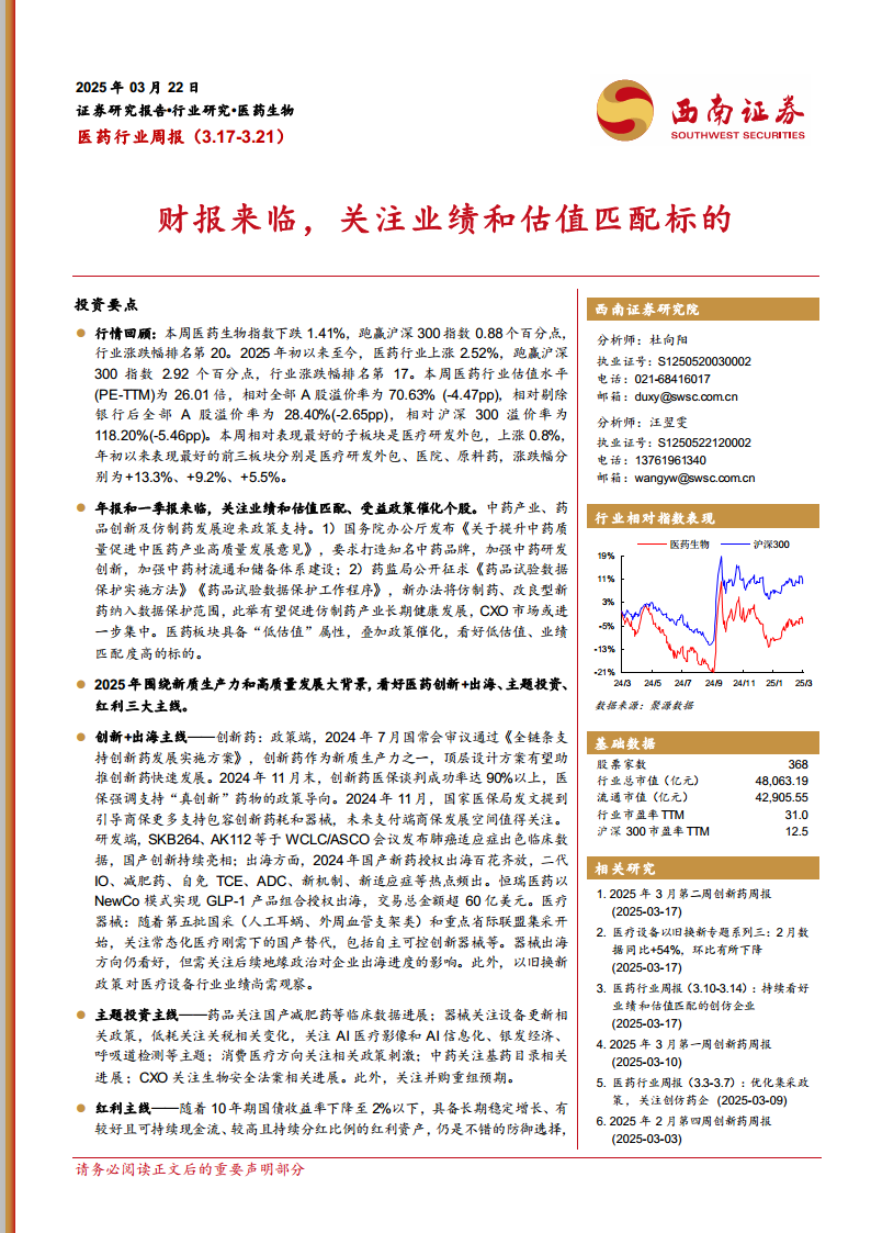 本报告核心观点指出,在年报和一季报密集发布之际,医药行业正经历业绩与估值的再匹配。政策层面,中药产业高质量发展和药品试验数据保护新规为行业带来结构性支持。市场表现上,医药生物指数虽短期下跌,但年初至今跑赢大盘,估值水平相对A股仍有溢价。