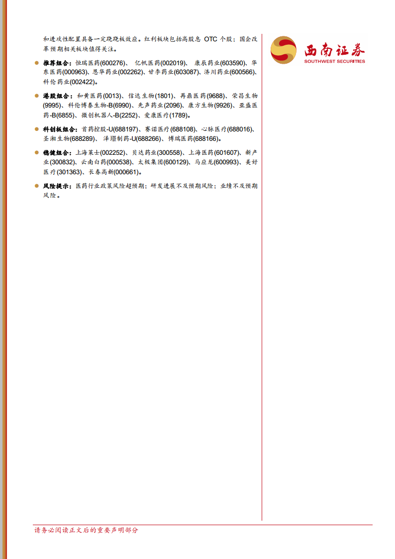 本报告提示投资者关注医药行业政策风险超预期、研发进展不及预期风险以及业绩不及预期风险。