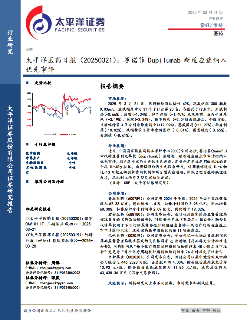创新药研发取得重要进展,如赛诺菲Dupilumab新适应症获优先审评,以及多家上市公司的业绩增长和产品获批,共同构成了当日医药市场的主要特征。