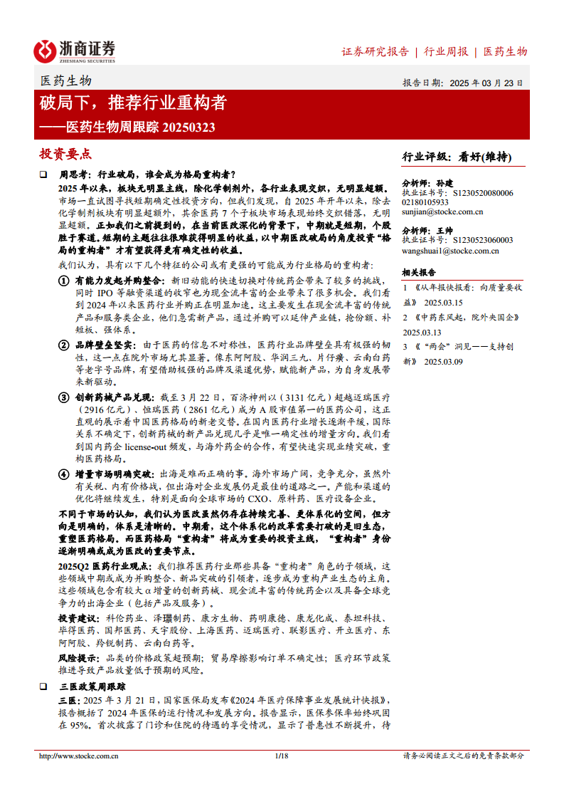 报告强调,2025年第二季度医药行业的投资策略应围绕具备“重构者”角色的子领域展开。这些领域预计将成为并购整合和新品突破的引领者,逐步重塑产业生态。具体包括具有较大α增量的创新药械企业、现金流充裕的传统药企,以及具备全球竞争力的出海型企业(涵盖产品及服务)。报告同时提示了政策变动、新品商业化不及预期及业绩低于预期等风险。
