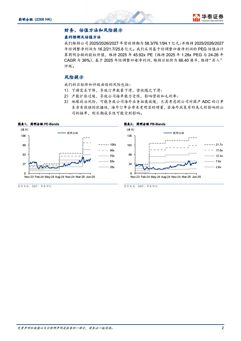 华泰研究维持药明合联2025-2027年经调整净利润预测分别为16.2亿元、21.7亿元和25.8亿元,对应每股收益(EPS)分别为1.35元、1.81元和2.03元。公司2024-2026年经调整净利润复合年增长率(CAGR)维持在36%。基于2025年1.28倍的PEG(对应2025年45.92倍PE),维持目标价66.40港币,并重申“买入”评级。