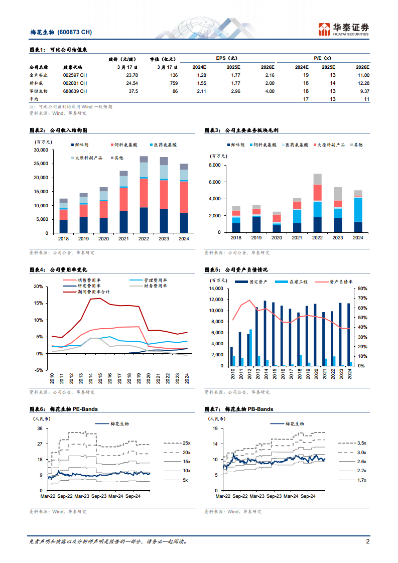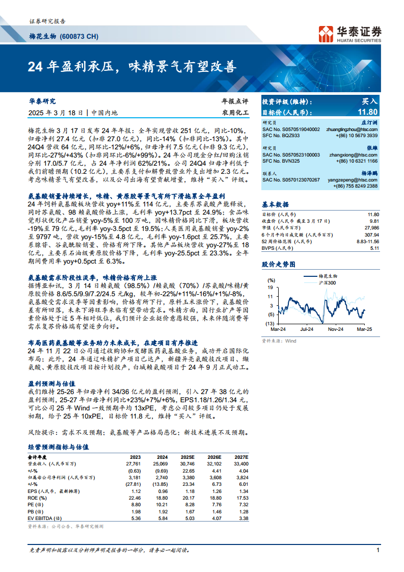 梅花生物2024年业绩受到味精和黄原胶等产品景气度下滑以及一次性支付和解费的影响,营收和归母净利润均出现同比下降。然而,公司在饲料氨基酸板块表现强劲,并通过高比例分红和回购积极回报股东。展望未来,随着味精行业景气度有望改善,以及公司在医药氨基酸领域的国际化布局和多个在建项目的有序推进,预计将为公司带来新的增长动力。基于对未来盈利改善的预期,华泰研究维持对梅花生物的“买入”评级。