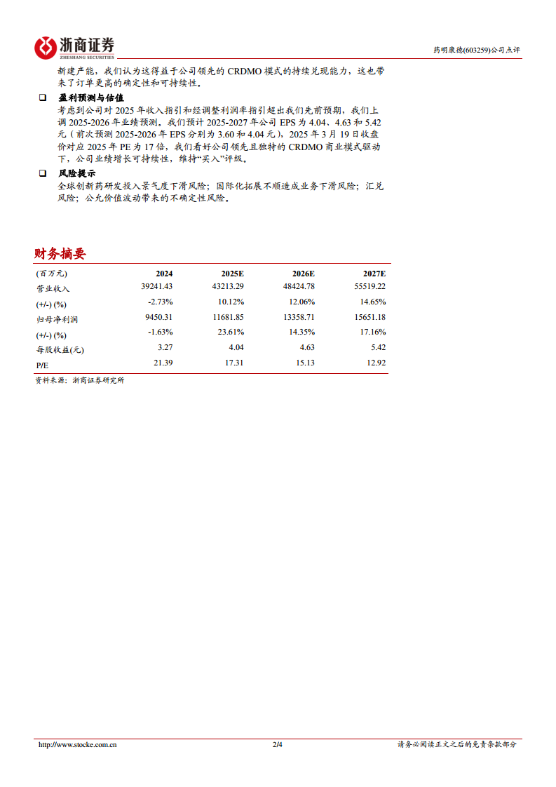 药明康德在2024年展现出稳健的经营韧性,尤其在第四季度实现了收入和利润的历史新高,并在手订单大幅增长47.0%至493.1亿元,远超市场预期。公司预计2025年资本开支将重回70-80亿元高位,以持续扩张全球产能,这得益于其独特的CRDMO模式带来的订单确定性和可持续性。展望未来,公司预计2025年持续经营业务收入将实现10%-15%的双位数增长,并有望进一步提升净利率。化学业务中的TIDES和小分子D&M表现强劲,而测试业务中的SMO保持领先。尽管面临全球创新药研发投入波动、国际化拓展及汇兑等风险,但分析师上调了公司盈利预测,并维持“买入”评级,看好其CRDMO模式驱动下的长期可持续增长潜力。