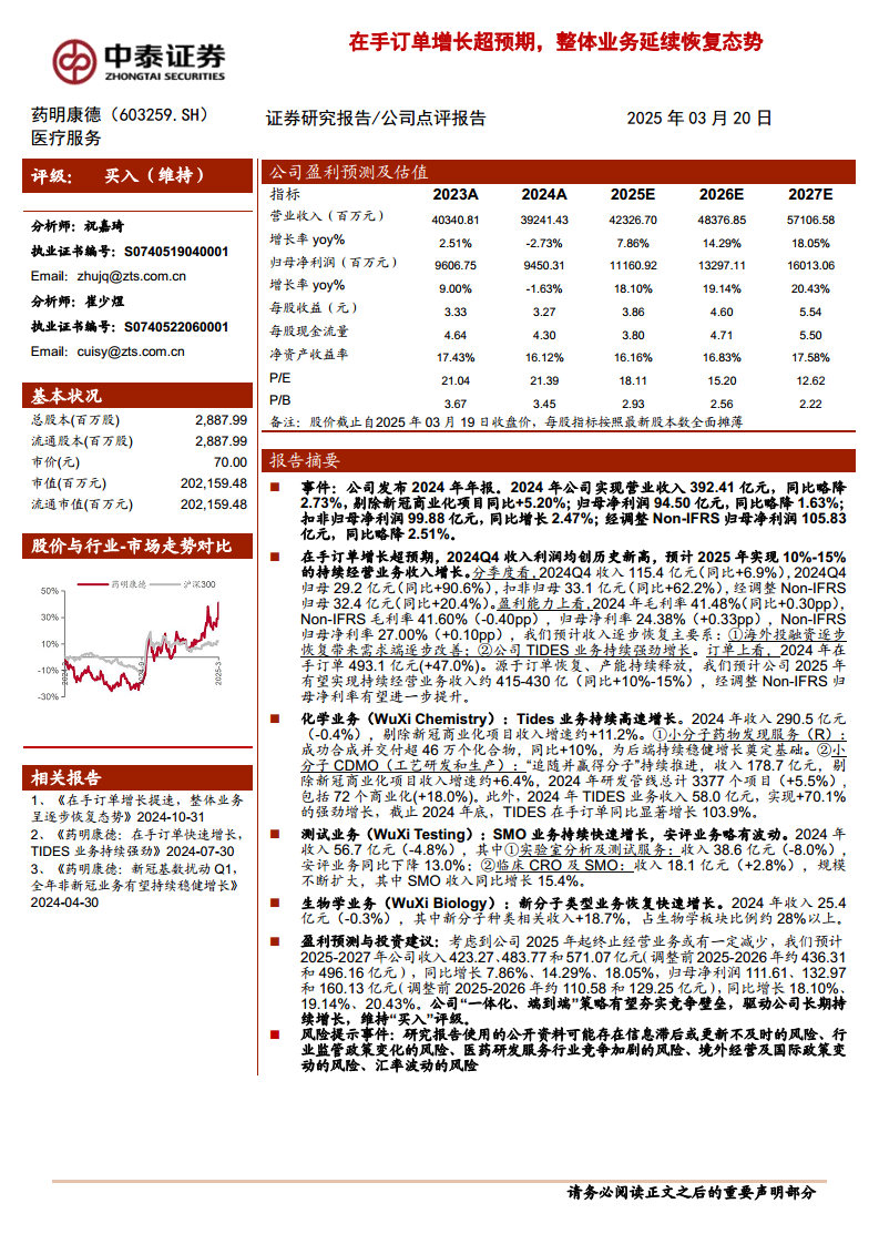 公司“一体化、端到端”的策略有望持续夯实竞争壁垒,驱动公司长期持续增长。基于此,分析师维持对药明康德的“买入”评级。