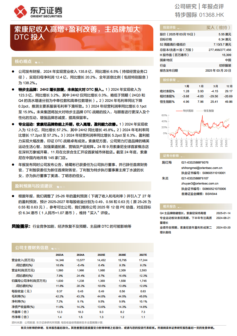 特步国际(01368):索康尼收入高增+盈利改善,主品牌加大DTC投入
