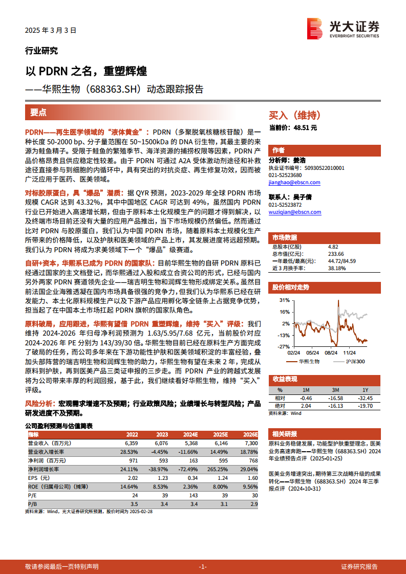 报告强调,华熙生物(688363.SH)凭借其前瞻性的“自研+资本”战略,已在国内PDRN赛道占据主导地位,成为“国家队”角色。公司不仅自身完成了PDRN原料的医疗器械主文档登记,还通过投资瑞吉明生物和与润辉生物成立合资公司,形成了强大的“华熙系”阵营。这一布局使其在原料获取、技术研发(包括重组PDRN)、规模化生产及下游产品孵化(护肤与医美)等全产业链环节构筑了深厚的