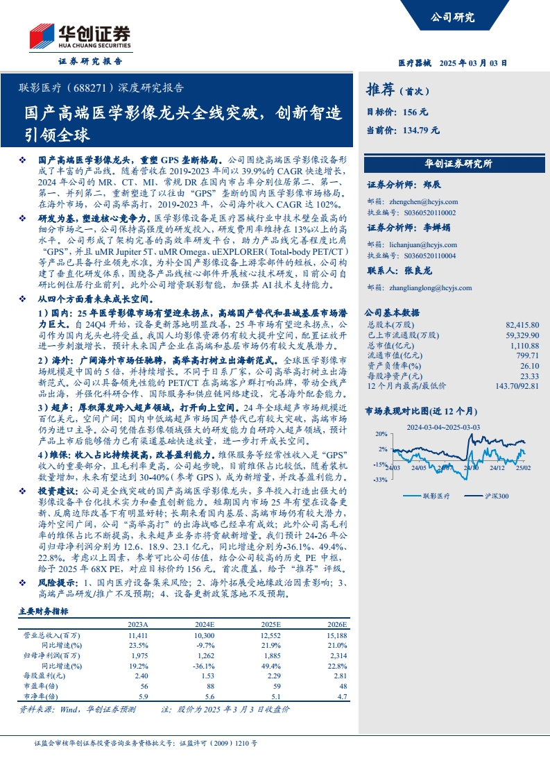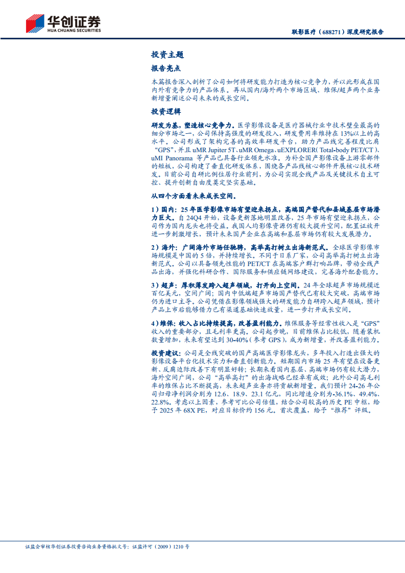 基于对国内市场复苏、海外市场扩张、超声业务新增量以及维保收入占比提升的预期,华创证券预测联影医疗2024-2026年总营收分别为103.0亿元、125.5亿元、151.9亿元,营收增速分别为-10%、22%、21%。归母净利润预计分别为12.6亿元、18.9亿元、23.1亿元,同比增速分别为-36.1%、49.4%、22.8%。毛利率预计将从2024年的49.5%逐步提升至2026年的51.3%。综合考虑公司作为国产高端医学影像龙头的地位、强大的研发实力、多维度的成长驱动因素以及较高的历史PE中枢,华创证券给予公司2025年68倍PE估值,对应目标价约156元,首次覆盖给予“推荐”评级。