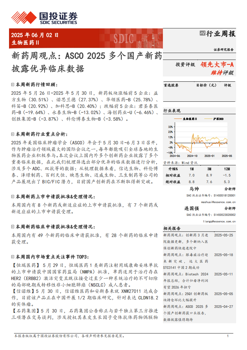 新药周观点:ASCO2025多个国产新药披露优异临床数据
