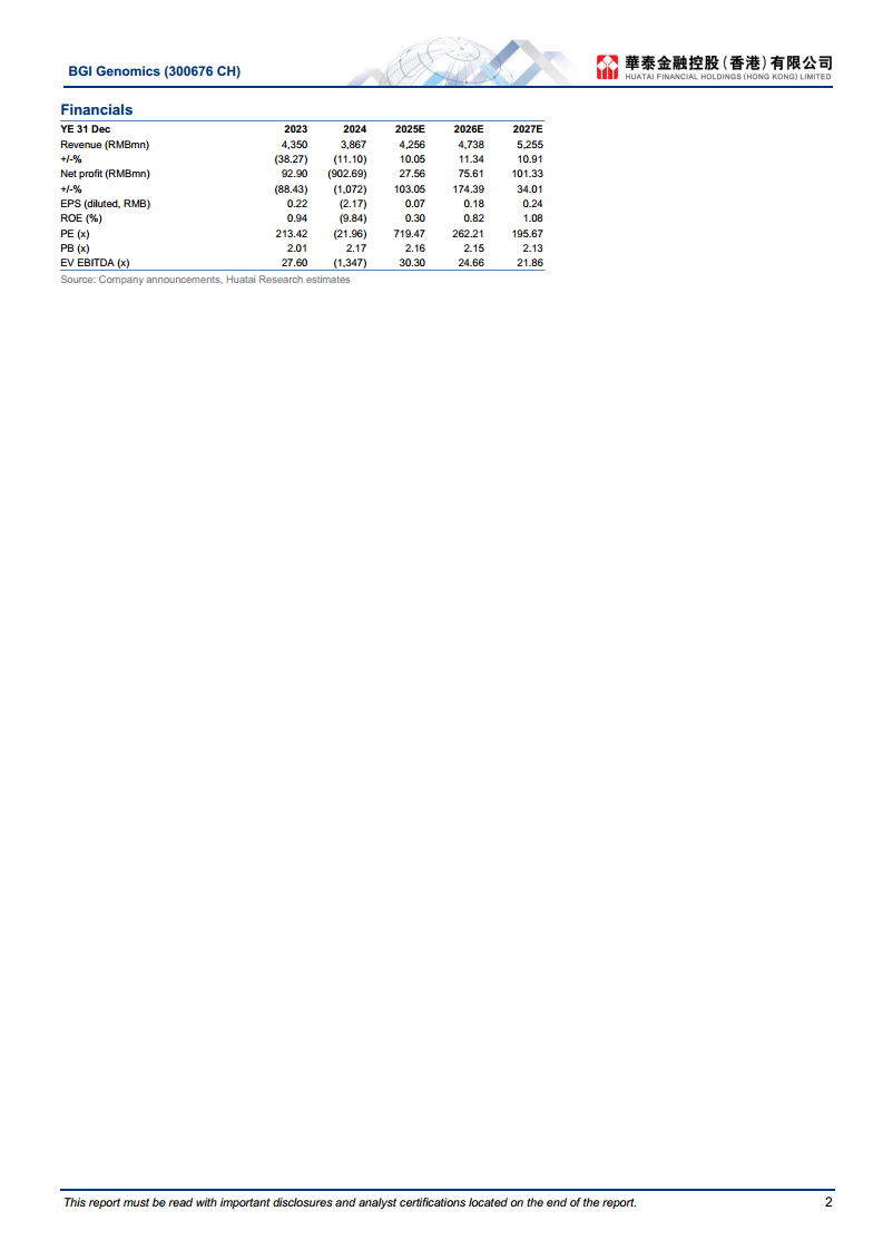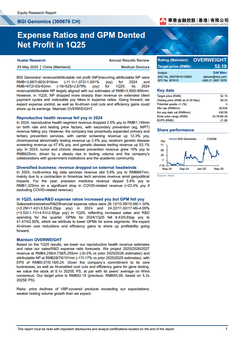 公司在生殖健康业务方面,虽然受到出生率下降和检测价格因素影响,但通过积极布局携带者筛查、染色体异常检测、新生儿遗传病筛查和遗传病检测等新兴细分市场,实现了这些领域的快速增长。肿瘤及慢性病预防业务则保持了稳健的增长态势。然而,多组学大数据服务和精准医学业务受到外部环境(如地缘政治和新冠相关业务收缩)的影响而下滑。华泰研究基于最新的财务表现,下调了对公司未来营收和净利润的预测,但鉴于公司对核心业务的承诺以及AI技术在基因检测领域降本增效的潜力,维持“增持”评级,并对目标价进行了小幅调整。