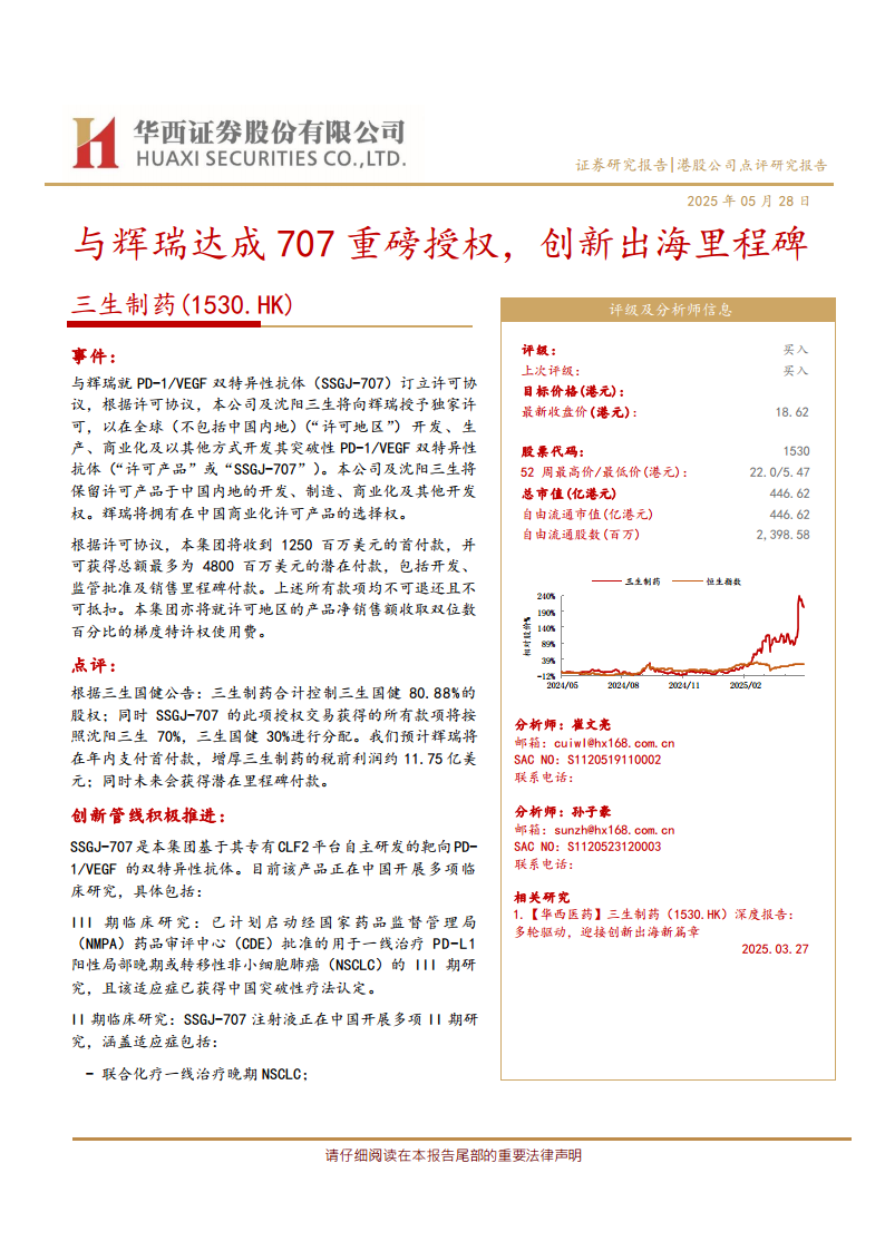 三生制药(1530.HK)及其子公司沈阳三生与辉瑞公司就其自主研发的PD-1/VEGF双特异性抗体SSGJ-707签订了独家许可协议。根据协议,辉瑞获得了SSGJ-707在全球范围(不包括中国内地)的独家开发、生产、商业化及其他开发权利,而三生制药集团保留了该产品在中国内地的所有权利,并赋予辉瑞在中国市场商业化该产品的选择权。