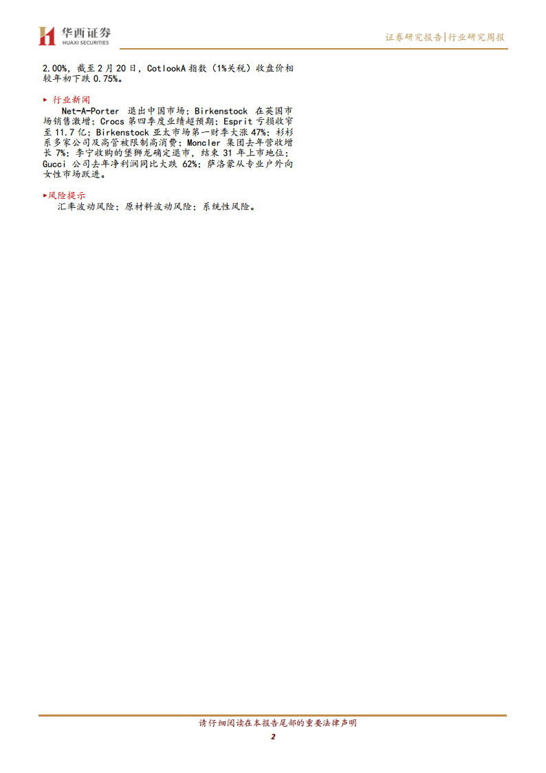 终端消费市场呈现线上线下分化。线上运动品类表现强劲,抖音和淘宝天猫平台均有品牌实现高速增长,尤其锦泓集团在天猫平台增速最高。但整体服装行业线上销售额在2025年1月出现同比下降。线下零售市场在2024年全年面临压力,但12月降幅收窄,家电类商品表现突出。行业新闻则反映了奢侈品电商的调整(Net-A-Porter退出中国)、传统品牌的转型困境(堡狮龙退市、Esprit亏损收窄)以及新兴品牌和细分市场的增长机遇(Birkenstock、Crocs、Moncler、萨洛蒙拓展女性市场)。