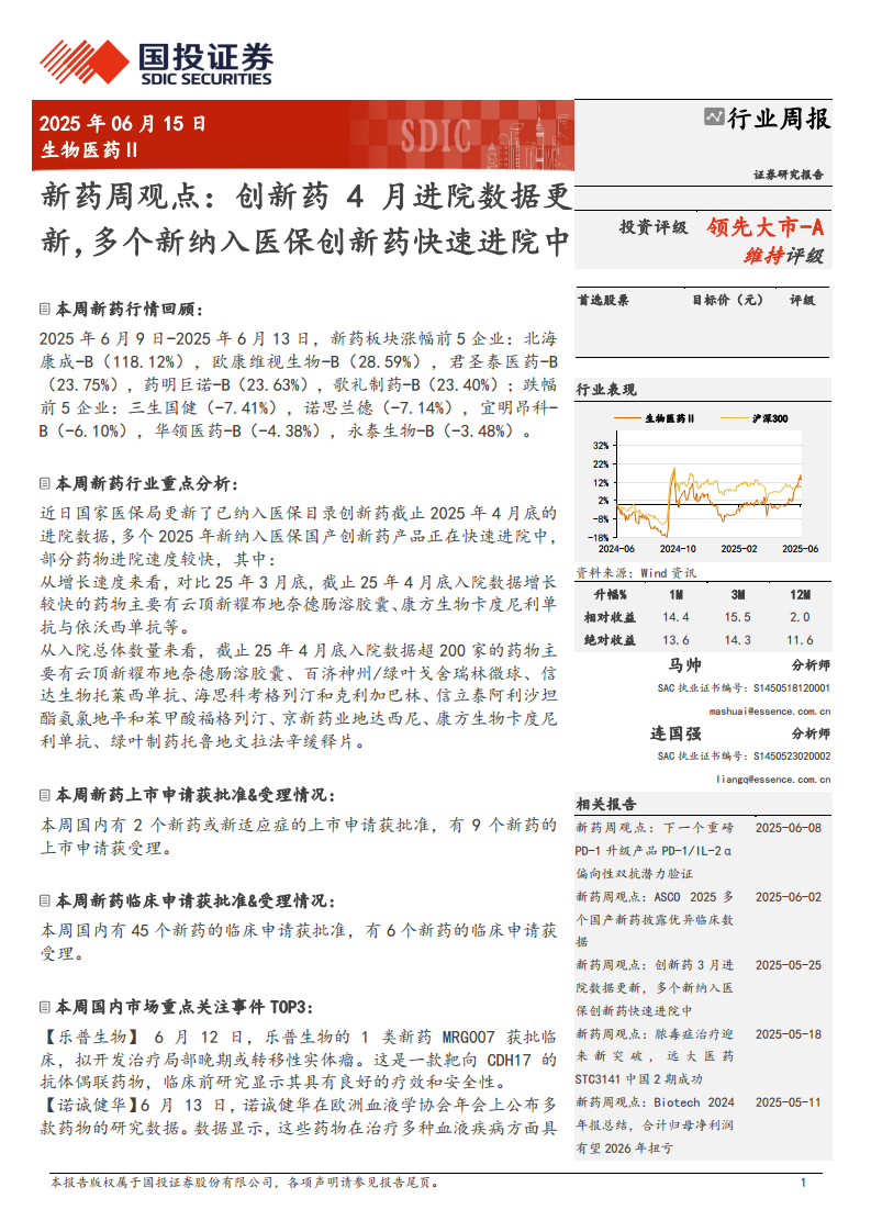 在2025年6月9日至6月13日期间,新药板块呈现出显著的市场波动。涨幅前五的企业包括北海康成-B(118.12%)、欧康维视生物-B(28.59%)、君圣泰医药-B(23.75%)、药明巨诺-B(23.63%)和歌礼制药-B(23.40%),显示出部分创新药企业强劲的增长势头。与此同时,跌幅前五的企业为三生国健(-7.41%)、诺思兰德(-7.14%)、宜明昂科-B(-6.10%)、华领医药-B(-4.38%)和永泰生物-B(-3.48%)。整体而言,生物医药Ⅱ行业在过去1个月、3个月和12个月内均实现了对沪深300指数的相对收益领先,绝对收益也保持增长,表明行业整体表现优于大盘。