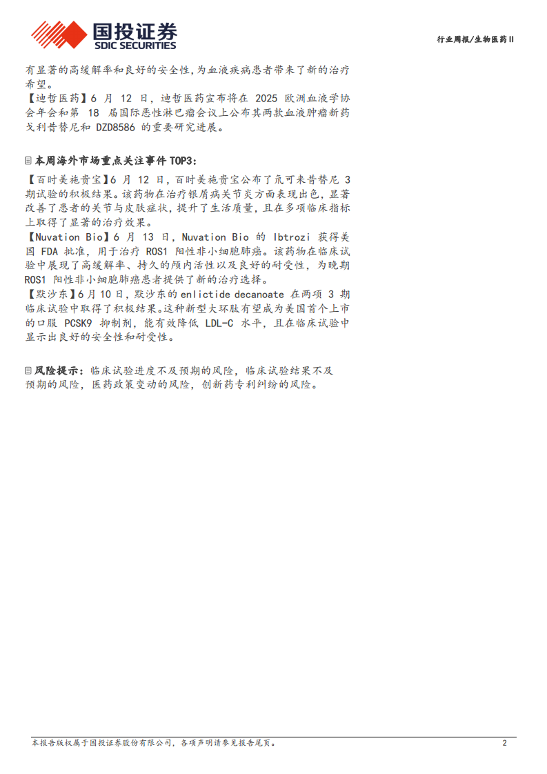 本周报深入分析了2025年6月9日至6月13日生物医药Ⅱ新药板块的市场动态与研发进展。核心观点指出,中国创新药市场持续活跃,尤其受益于国家医保政策的推动,多个新纳入医保的国产创新药产品正实现快速进院,市场渗透率显著提升。同时,国内外新药研发管线持续丰富,多款创新药物在上市审批和临床试验方面取得重要进展,为患者带来新的治疗希望。