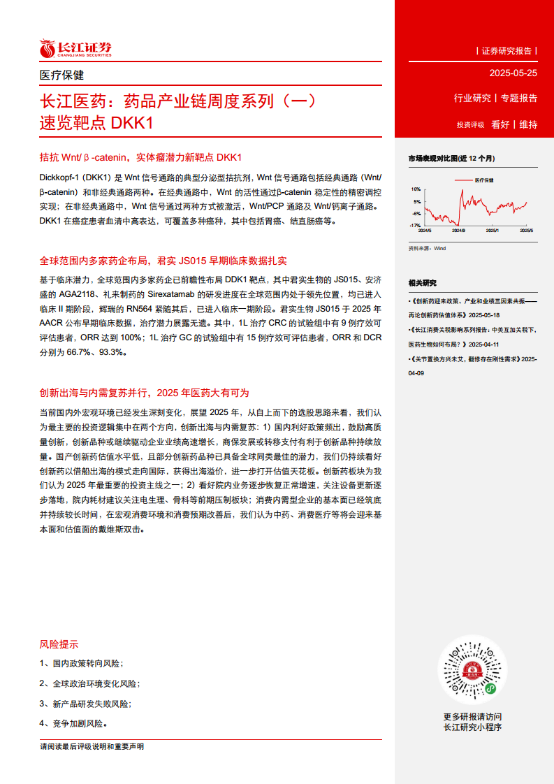 本报告深入分析了DKK1作为实体瘤(特别是胃癌和结直肠癌)潜在新靶点的价值,并详细阐述了其独特的Wnt信号通路拮抗机制。报告强调,君实生物的JS015在早期临床试验中展现出卓越的治疗效果和良好的安全性,尤其在晚期结直肠癌和胃癌治疗中取得了令人鼓舞的ORR和DCR数据,使其在全球DKK1靶点药物研发中占据领先地位。此外,报告还为2025年医药行业的投资提供了专业指引,建议重点关注创新药出海、CXO、医疗器械、生命科学服务、中药和生物制品等细分领域的结构性投资机会,并提醒投资者需警惕政策、地缘政治、研发失败和市场竞争加剧等潜在风险。